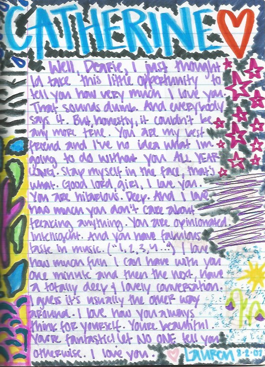 I found a letter from Lauren written in the back of one of my old journals, and in it she said: “I love how you don’t care about freaking anything, you always think for yourself.” And I like that I have that—I like having so many of her letters and doodles from when we were teenagers because it reminds me that she was the first person who ever believed in me without question. She took one look at me and said, “I like you,” and nobody else mattered after that, because Lauren doesn’t lie. She’s honest; she’s the most sincere person I have ever met. And I love her endlessly for that because, most of the time, I feel like I’m navigating a very, very, insincere world.